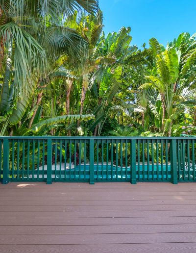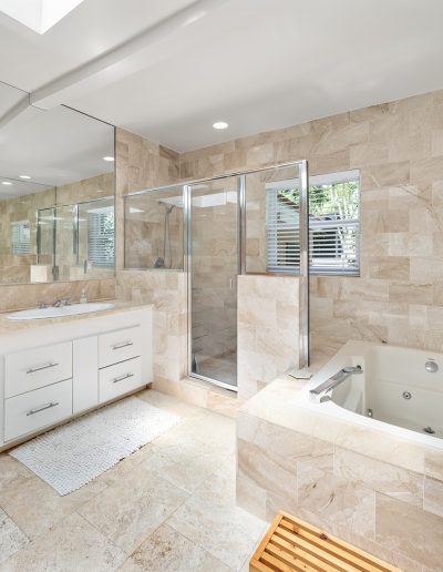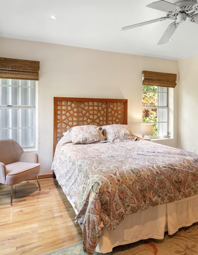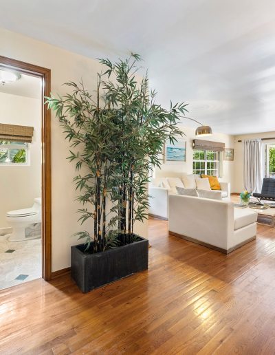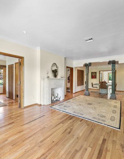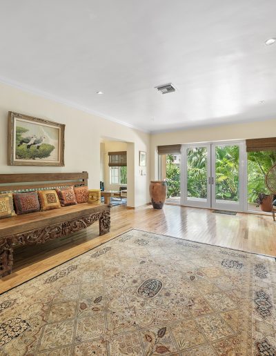 The spacious primary suite features a spa-like bath with skylight, and French doors opening to a private backyard oasis with a pool, open patio, and a rooftop terrace accessed by winding stairs. Two additional bedrooms are bright and spacious, complemented by a separate family room in the rear that enhances the home’s flexible living space.